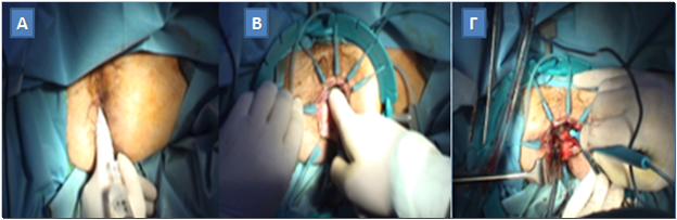Περινεϊκοί χρόνοι της μεσοσφιγκτηριακής εκτομής: Α. Διήθηση με επινεφρίνη. Β. Τοποθέτηση του ειδικού άγκιστρου Lone Star. Γ. Μεσοσφιγκτηριακή παρασκευή
