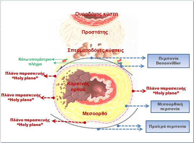 Η ολική μεσοορθική εκτομή αποτελεί αναπόσπαστο κομμάτι κάθε σωστής ογκολογικά επέμβασης για καρκίνο του ορθού. Φαίνονται διαγραμματικά οι ανατομικές σχέσεις με σημαντικές δομές της περιοχής