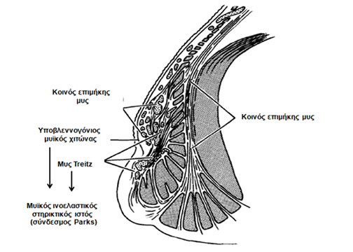 Δ. Διαγραμματική απεικόνιση της απολίνωσης των τελικών κλάδων της άνω αιμορροϊδικής αρτηρίας και της αιμορροϊδοπηξίας με συνεχή ραφή