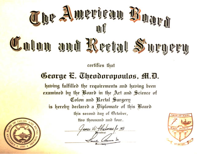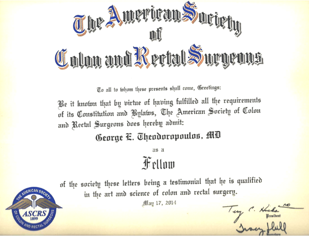 - Οκτώβριος 2004, Διπλωματούχος American Board of Colon & Rectal Surgery