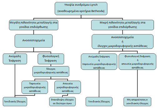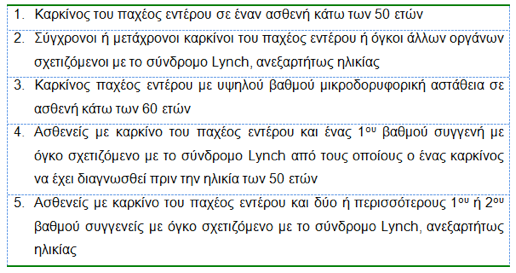 Σήμερα, για την επιλογή των ασθενών με καρκίνο παχέος εντέρου που θα ελεγχθούν για ύπαρξη μοριακών αλλαγών ή εκείνων με μικροδορυφορική αστάθεια που θα ελεγχθούν για μεταλλαγές στα γονίδια επιδιόρθωσης χρησιμοποιούνται τα κριτήρια του Άμστερνταμ ΙΙ ή τα αναθεωρημένα κριτήρια της Bethesda (Πίνακες 4, 5).