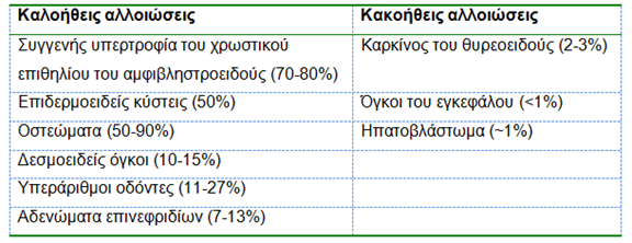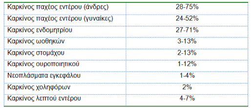 Οι ασθενείς που φέρουν μεταλλαγή στα γονίδια επιδιόρθωσης του DNA εμφανίζουν υψηλό κίνδυνο ανάπτυξης καρκίνου του παχέος εντέρου, του ενδομητρίου και μιας σειράς άλλων νεοπλασμάτων που συνοψίζονται στον Πίνακα 3 (14, 15). Οι καρκίνοι αυτοί εντοπίζονται σε νεαρή ηλικία και μπορεί να είναι σύγχρονοι.