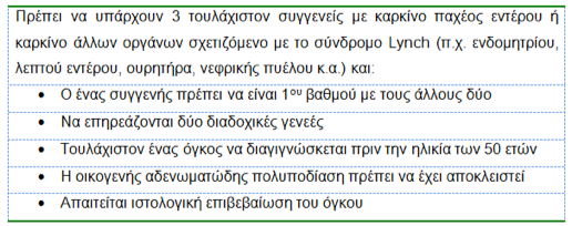 Το 1989 διατυπώθηκαν στο Άμστερνταμ ορισμένα κριτήρια ένταξης των συγκεκτιμένων οικογενειών στο σύνδρομο Lynch (16). Τα κριτήρια αυτά αναθεωρήθηκαν τo 1999 ώστε να περιλαμβάνουν και τις εξωεντερικές εκδηλώσεις της νόσου (17). Το 1997 προτάθηκαν τα κριτήρια της Bethesda με στόχο να καθορίζονται τα άτομα που πρέπει να υποβάλλονται σε έλεγχο μικροδορυφορικής αστάθειας (18, 19). Τα κριτήρια αυτά αναθεωρήθηκαν το 2004 (20). Με βάση τα κριτήρια αυτά έχει αναγνωρισθεί μια μεγάλη ομάδα οικογενειών που εντάσσονται στο σύνδρομο Lynch. Πρέπει να σημειωθεί ότι η ονομασία κληρονομικός μη πολυποδιακός καρκίνος του παχέος εντέρου (Hereditary Non Polyposis Colorectal Cancer – HNPCC) που προτάθηκε στο Άμστερνταμ το 1989 σταδιακά εγκαταλείφθηκε, καθώς δεν περιελάμβανε τους όγκους σε άλλα όργανα που συχνά παρατηρούνται. Έτσι καθιερώθηκε η ονομασία σύνδομο Lynch.