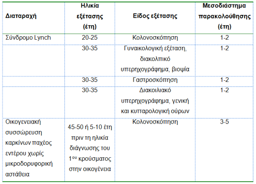 Στον Πίνακα 6 συνοψίζονται οι κατευθυντήριες οδηγίες παρακολούθησης των οικογενειών με σύνδρομο Lynch. Οι οδηγίες αυτές έχουν ένδειξη σε οικογένειες με γνωστή μεταλλαγή στα γονίδια επιδιόρθωσης καθώς και σε οικογένειες με συσσώρευση περιστατικών καρκίνου παχέος εντέρου ή άλλων σχετιζόμενων καρκίνων και υποψία βλάβης του συστήματος επιδιόρθωσης (παρουσία μικροδορυφορικής αστάθειας ή απώλεια της έκφρασης των γονιδίων επιδιόρθωσης).