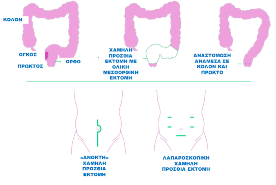 Η βασική διακοιλιακή επέμβαση που εφαρμόζεται σε διάφορες παραλλαγές για την αντιμετώπιση του καρκίνου του ορθού καλείται χαμηλή πρόσθια εκτομή. Στα έμπειρα χέρια των εξειδικευμένων χειρουργών παχέος εντέρου εφαρμόζεται και σε καρκίνους που βρίσκονται χαμηλά στο ορθό, δηλαδή κοντά στο σφιγκτήρα του πρωκτού.