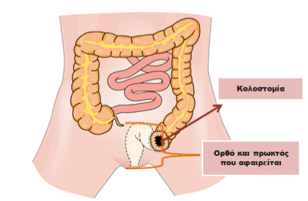 Σε κάποιες περιπτώσεις, όταν ο καρκίνος είναι τοπικά πολύ προχωρημένος και έχει εισβάλει μέσα στο σφιγκτήρα του πρωκτού, η χαμηλή πρόσθια εκτομή δεν είναι ούτε εφικτή ούτε και δόκιμη επιλογή. Σε μία τέτοια περίπτωση διενεργείτια η κοιλιοπερινεϊκή εκτομή, οπότε αφαιρείται και ο πρωκτός με το σφιγκτήρα που τον περιβάλλει. Δημιουργείται μία μόνιμη «παρά φύσιν» έδρα στην αριστερή κάτω κοιλιακή χώρα από το κόλον που απομένει, η οποία λέγεται κολοστομία. Ο ασθενής δεν έχει πια τη δυνατότητα να αφοδεύει κανονικά και τα κόπρανα αποβάλλονται από την κολοστομία.