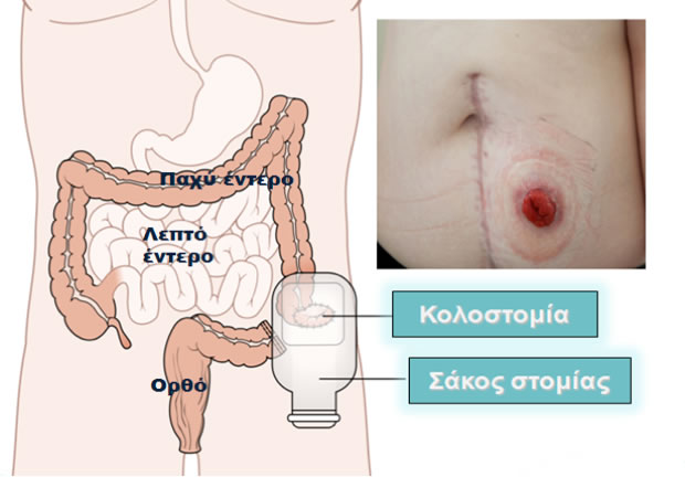 Μερικές φορές αυτή η συνένωση δεν είναι εφικτή τεχνικά ή και δεν επιτρέπεται να γίνει αμέσως στο χειρουργείο. Σε τέτοιες περιπτώσεις ο χειρουργός είναι αναγκασμένος να δημιουργήσει ένα άλλο «μονοπάτι» μέσα από το οποίο θα βρίσκουν δρόμο για να εξέλθουν τα περιττώματα από τον οργανισμό. Έτσι δημιουργεί ένα άνοιγμα στο τοίχωμα της κοιλιάς και μέσα από αυτό βγάζει το κεντρικό τμήμα του υγιούς εντέρου έξω από την κοιλιά και το ράβει έτσι ώστε να καθηλωθεί πάνω στο κοιλιακό δέρμα. Δημιουργεί μία στομία, δηλαδή μία «παρά φύσιν» έδρα. Η στομία που δημιουργείται από το παχύ έντερο λέγεται κολοστομία, ενώ η στομία που δημιουργείται από το λεπτό έντερο λέγεται ειλεοστομία. Γύρω από τις στομίες εφαρμόζεται ένας ειδικός σάκκος για τη συλλογή των κοπράνων. Οι περισσότερες από αυτές τις στομίες μπορούν να αναστραφούν μετά από μερικούς μήνες και να αποκατασταθεί πάλι η συνέχεια του εντερικού σωλήνα.