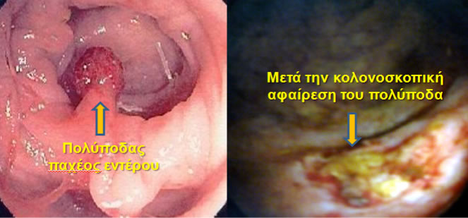 Πολύποδες παχέος εντέρου: Οι πολύποδες είναι νεοπλάσματα, με άλλα λόγια όγκοι που δημιουργούνται από αφύσικο πολλαπλασιασμό κυττάρων στην εσωτερική επιφάνεια, δηλαδή στο βλεννογόνο του παχέος εντέρου. Ο καρκίνος επίσης είναι όγκος που εμφανίζεται με ανάλογο τρόπο, όμως στον καρκίνο τα κύτταρα είναι πιο επιθετικά, έχουν διηθήσει το τοίχωμα του εντέρου πιο πέρα από το βλεννογόνο, αλλά και έχουν την ιδιότητα να δημιουργούν μεταστάσεις. Έτσι οι απλοί πολύποδες, επειδή έχουν καλύτερη βιολογική συμπεριφορά, ονομάζονται καλοήθη νεοπλάσματα, ενώ οι καρκίνοι είναι τα κακοήθη νεοπλάσματα του παχέος εντέρου. Η αλήθεια είναι ότι η πλειοψηφία των καρκίνων του παχέος εντέρου δημιουργούνται από πολύποδες. Βέβαια όλοι οι πολύποδες δεν αλλάζουν και γίνονται καρκίνοι. Επειδή όμως δεν γνωρίζουμε ποιοι πολύποδες θα γίνουν τελικά καρκίνοι, είναι καλό να τους ανιχνεύουμε όσο πιο νωρίς γίνεται και να τους αφαιρούμε πριν γίνουν καρκίνοι. Για να γίνει αυτό με επιτυχία, ο καλύτερος τρόπος είναι η κολονοσκόπηση, δηλαδή αυτή η ειδική εξέταση με την οποία εξετάζεται η εσωτερική επένδυση του παχέος εντέρου και εάν βρεθούν πολύποδες αφαιρούνται την ίδια στιγμή με τη βοήθεια ενός ειδικού εργαλείου, που λέγεται ενδοσκοπικός βρόγχος.  Όπως και ο καρκίνος, οι πολύποδες του παχέος εντέρου εμφανίζονται κυρίως σε ανθρώπους ηλικίας άω των 50 ετών. Η πρώϊμη ανεύρεσή τους και η αφαίρεση τους, πριν μετατραπούν σε καρκίνο, με τη βοήθεια της κολονοσκόπησης στην οποία πρέπει να υποβάλλονται οι άνθρωποι στα 50 χρόνια της ζωής τους, είναι ο αποτελεσματικότερος τρόπος πρόληψης και ελάττωσης του κινδύνου προσβολής από καρκίνο παχέος εντέρου.