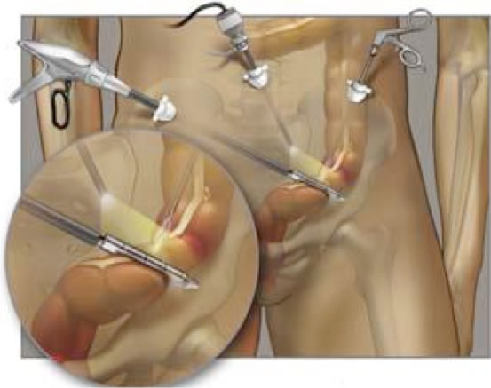 Λαπαροσκοπική προσπέλαση: Χρησιμοποιείται το λαπαροσκόπιο, το οποίο είναι ένας λεπτός ενδοσκοπικός σωλήνας, ο οποίος συνδέεται με μία πηγή φωτός και μία βίντεο-κάμερα. Ο χειρουργός βλέπει όλα τα όργανα της κοιλιάς με τη βοήθεια του λαπαροσκοπίου, χωρίς να χρειάζεται να «ανοίξει» την κοιλιά. Τρεις ή τέσσερις μικρές οπές γίνονται πάνω στην κοιλιά και μέσα από αυτές τοποθετούνται ειδικά, λεπτά χειρουργικά εργαλεία, τα οποία χρησιμοποιούνται για να απελευθερώσουν το παχύ έντερο από τις φυσικές προσφύσεις του και ταυτόχρονα για να αποκόψουν την αιμάτωσή του από τα τροφοφόρα αγγεία του και να καθαρίσουν τους λεμφαδένες που βρίσκονται στο λίπος που περιβάλει το παχύ έντερο. Το χειρουργικό παρασκεύασμα αφαιρείται μέσα από μία μικρή τομή που γίνεται στην κοιλιά. Έτσι ο ασθενής αποφεύγει το σημαντικό stress του «ανοικτού» χειρουργείου, νοιώθει καλύτερα μετά το χειρουργείο, αναρρώνει πιο γρήγορα, με λιγότερο πόνο και δυσφορία και επιστρέφει στο σπίτι του και στις καθημερινές ασχολίες του ταχύτερα.