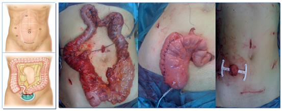 Λαπαροσκοπικά υποβοηθούμενη ολική ορθοκολεκτομή: Ολόκληρο το παχύ έντερο μετά τη λαπαροσκοπική κινητοποίησή του και την αποκοπή από την αιματωσή του αφαιρείται από μικρή γυναικολογική τομή, μέσα από την οποία δημιουργείται και η ειλεϊκή λήκυθος, η οποία αναστομώνεται με τον πρωκτικό αυλό