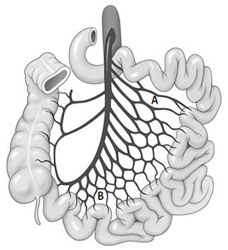 Αύξηση του αριθμού των μεσεντερικών αγγειακών τόξων από τη νήστιδα (Α) στον τελικό ειλεό (Β)