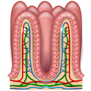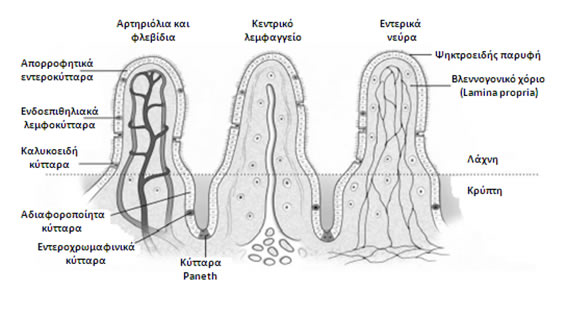 Το εντερικό επιθήλιο είναι ιδιαίτερα περίπλοκο και συντίθεται από ετερογενείς κυτταρικούς τύπους, οι οποίοι επικάθονται σε ένα καλά οργανωμένο συνδετικό ιστό μέσω μιας λεπτής βασικής μεμβράνης. Κάτω από αυτή μέσα στο συνδετικό ιστό της λάχνης (lamina propria) βρίσκεται ένα κεντρικό αρτηριόλιο που περιβάλλεται από ένα τριχοειδικό δίκτυο, το οποίο υποβοηθά την καλύτερη δυνατή αμφίδρομη ανταλλαγή οξυγόνου και διαλυτών ουσιών του πλάσματος, ενώ, ταυτόχρονα, αποτελεί το βασικό μονοπάτι για την απορρόφηση των θρεπτικών συστατικών.