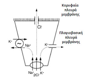 Η επιθηλιακή έκκριση Cl- περιλαμβάνει τη πρόσληψη Cl- από τη πλαγιοβασική πλευρά της μεμβράνης μέσω ενός συμμεταφορέα Νa+-Κ+-2Cl-, η οποία ακολουθείται από την έκκριση Cl- διά της κορυφαίας (προς τον αυλό) πλευράς της μεμβράνης μέσω ειδικών καναλιών Cl-, όπως του ρυθμιστή της διαμεμβρανικής αγωγιμότητας της κυστικής ίνωσης (Cystic Fibrosis Transmembrane Conductance Regulator, CFTR), ο οποίος και δυσλειτουργεί στην κυστική ίνωση, συγγενή πάθηση που συνοδεύεται από ξηρότητα των βλεννογόνων.