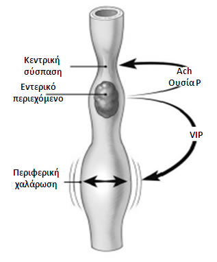Οι νευροδιαβιβαστές που εξυπηρετούν το εντερικό νευρικό σύστημα είναι χολινεργικές, αδρενεργικές, σεροτονινεργικές και πεπτιδεργικές, ενώ πολυάριθμα πεπτίδια εκκρίνονται από τους νευρώνες. Το περισταλτικό αντανακλαστικό απαιτεί την περιφερική χαλάρωση του εντέρου, η οποία ευοδώνεται με τη δράση του αγγειοδραστικού εντερικού πεπτιδίου (Vasoactive Intestinal Peptide, VIP) και την κεντρικότερη σύσπαση του, που διεγείρεται από την ακετυλοχολίνη και την ουσία P.
