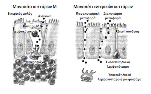 Πάνω από τις πλάκες Peyer βρίσκονται τα κύτταρα Μ, τα οποία λειτουργούν ως σημαντικές πύλες εισόδου για τα ξένα αντιγόνα. Εγκολπώσεις στη μεμβράνη των Μ κυττάρων αποτελούν τις θέσεις όπου λεμφοκύτταρα και μακροφάγα συγκεντρώνονται και έρχονται με τα αντιγόνα από τον αυλό προκειμένου, στη συνέχεια, να τα παρουσιάσουν στα υποκείμενα λεμφικά θυλάκια των πλακών Peyer. Ο πολλαπλασιασμός των λεμφοκυττάρων που λαμβάνει χώρα μέσα στις πλάκες αυτές οδηγεί στην παραγωγή Β πλασματοκυττάρων που εκκρίνουν IgA, τα οποία μεταναστεύουν σε επιχώριους λεμφαδένες και στη συστηματική κυκλοφορία, από όπου μεταναστεύουν πίσω και εγκαθίστανται σε μεγάλους αριθμούς μέσα στα υποβλεννογόνια στρώματα. Εκεί τα ώριμα Τ λεμφοκύτταρα, τα Β κύτταρα και τα μακροφάγα ασκούν την ανοσολογική δράση τους, όπως φαγοκυττάρωση και παραγωγή κυτοκινών.