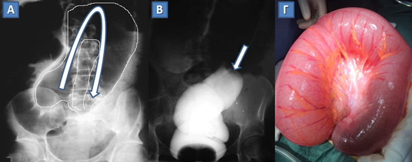 Β. Υποκλυσμός με γαστρογραφίνη, όπου η προώθηση του σκιαγραφικού διακόπτεται στη θέση της απόφραξης που προκαλεί η συστροφή (βέλος).