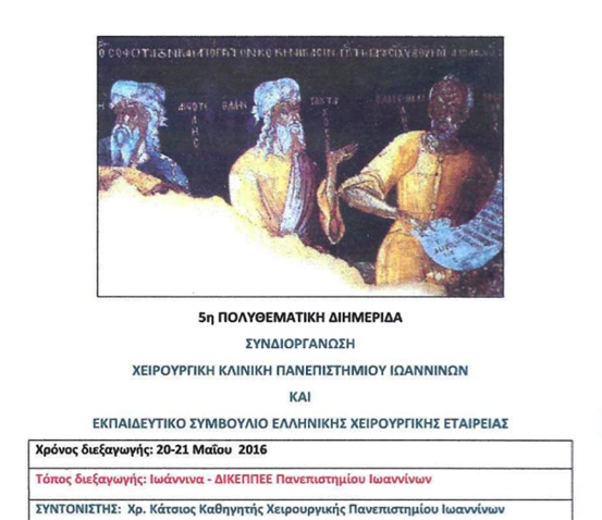 Το Μάιο του 2016, στα πλαίσια των Μετεκπαιδευτικών Μαθημάτων της Ελληνικής Χειρουργικής Εταιρείας για το Ακαδημαϊκό έτος 2015-2016, διοργανώθηκε η 5η πολυθεματική διημερίδα του προγράμματος στα Ιωάννινα. Για την οργάνωση της επιστημονικής αυτής εκδήλωσης, το Εκπαιδευτικό Συμβούλιο της Ελληνικής Χειρουργικής Εταιρείας (Πρόεδρος: Ι. Παρασκευόπουλος, Διευθυντής Χειρουργικής Κλινικής στο Νοσοκομείο ΚΑΤ), συνεργάστηκε με την Πανεπιστημιακή Χειρουργική Κλινική της Ιατρικής Σχολής των Ιωαννίνων (Διευθυντής: Καθηγητής Χειρουργικής Χρ. Κάτσιος). Κατά τη συμμετοχή του στο στρογγυλό τραπέζι με θέμα: «Εγχειρητική και περιεγχειρητική διαχείριση καρκίνων στομάχου και παχέος εντέρου», το αντικείμενο της ομιλίας του Γ. Θεοδωρόπουλου ήταν οι «Επανεπεμβάσεις σε καρκίνο ορθού».